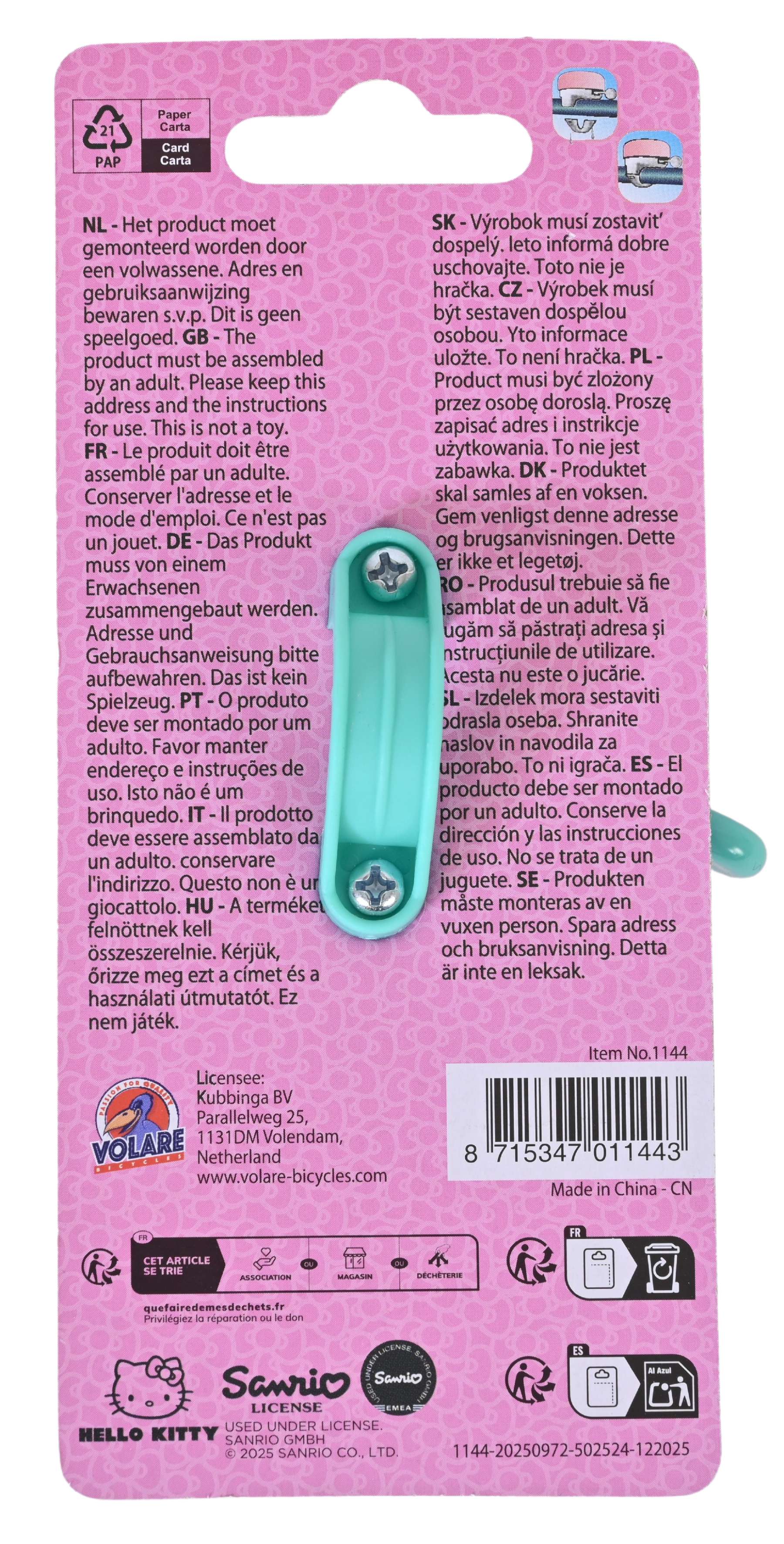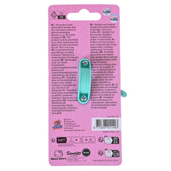 De Hello Kitty bel in roze maakt elke fiets net een stukje leuker. Met het vrolijke Hello Kitty design is het een echte eyecatcher op het stuur. Natuurlijk klinkt hij ook lekker duidelijk, zodat je goed hoorbaar bent onderweg. Eenvoudig te monteren en perfect voor elke kinderfiets.