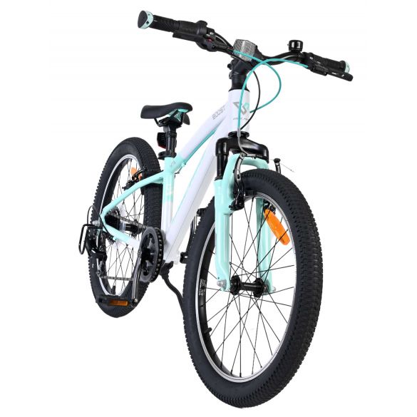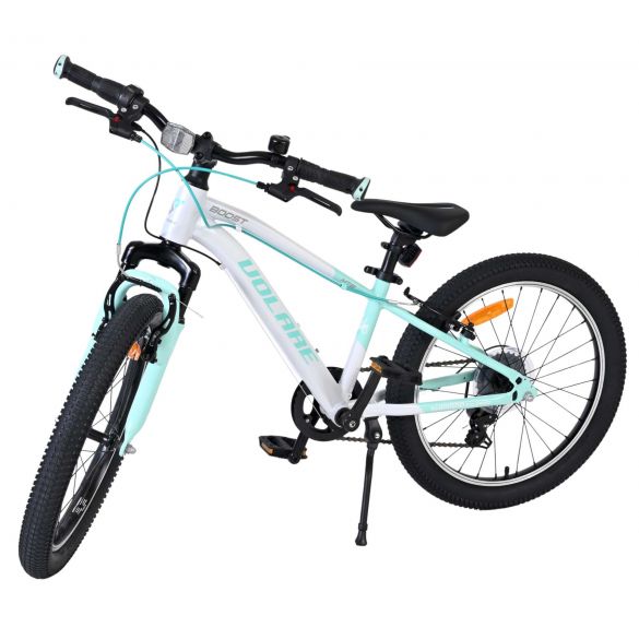 De Volare Boost 20 inch in wit met mintgroene accenten is een stoere, sportieve fiets voor kids die graag tempo maken én comfortabel willen rijden. Dankzij de 7 Shimano versnellingen schakel je soepel mee met elke rit, of je nu door de buurt fietst, een langere route maakt of tegenwind hebt.