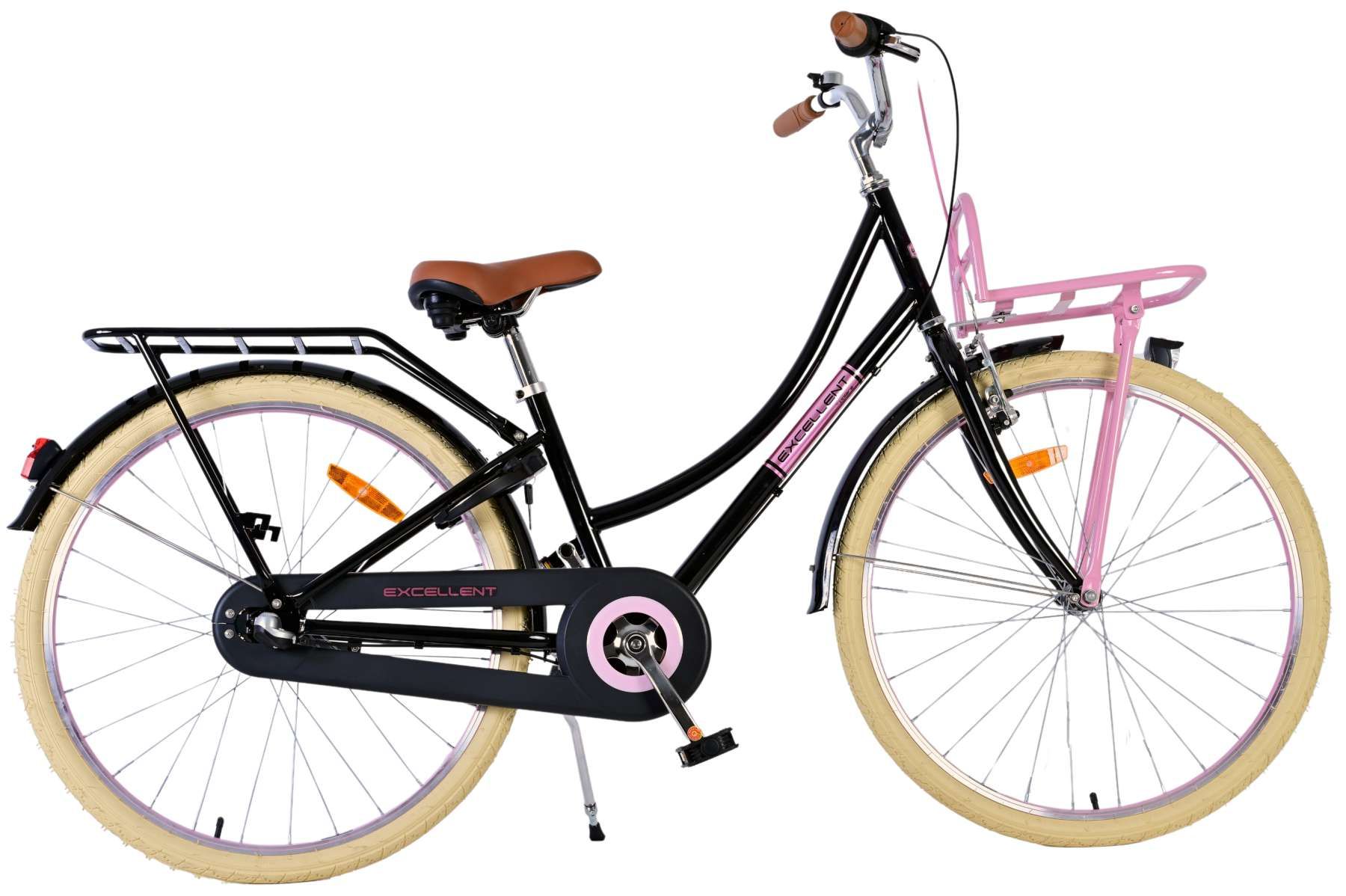 Sicherheit geht vor! Deshalb hat dieses coole Fahrrad eine Handbremse, 3 Gänge und eine Rücktrittbremse und einen geschlossenen Kettenschutz. Darüber hinaus hat das Fahrrad Reflektoren vorne und hinten und eine schöne Glocke. Auch an den Komfort wurde gedacht. Das schöne schwarze Volare-Fahrrad hat einen praktischen Frontgepäckträger, einen in den Rahmen integrierten Gepäckträger und einen luxuriösen, weichen Sattel. Damit Sie so lange wie möglich Freude an Ihrem Fahrrad haben, sind Sattel und Lenker höhenverstellbar.