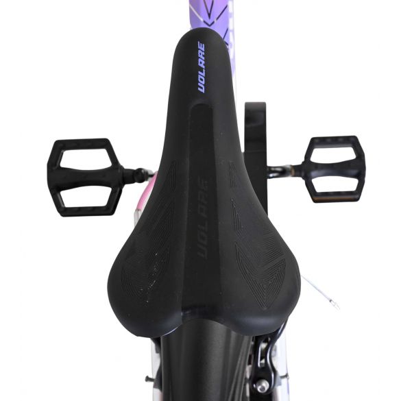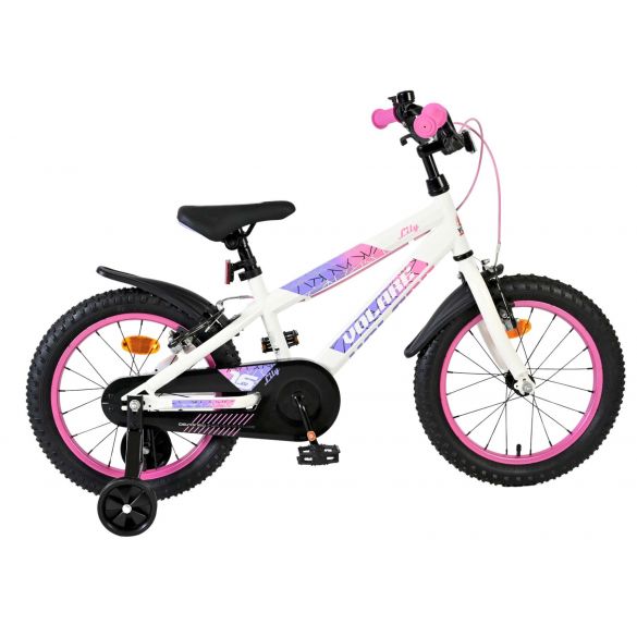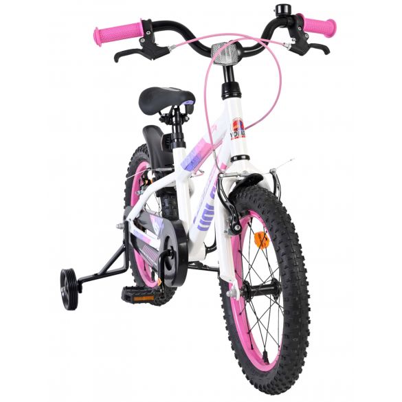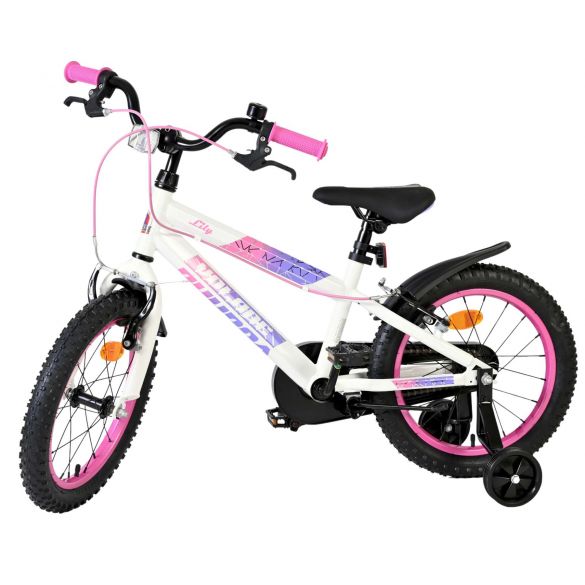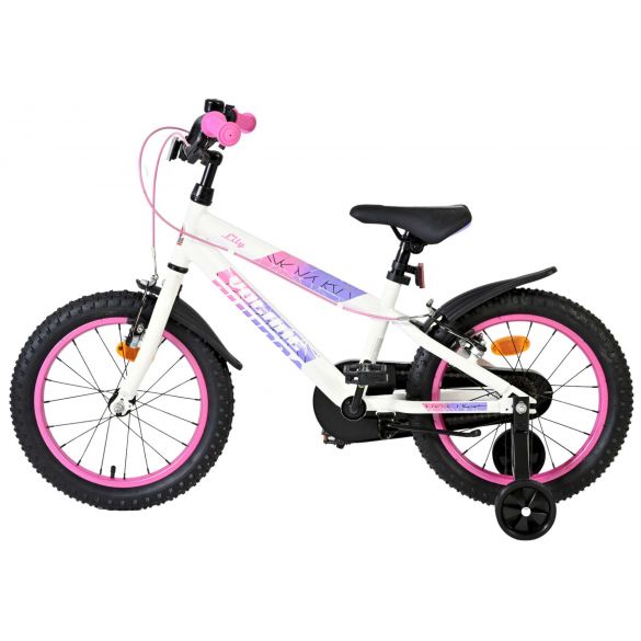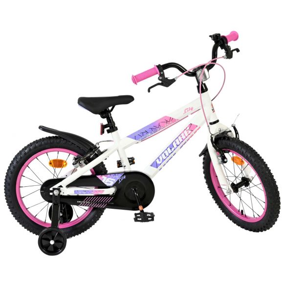 De Volare Lily 16 inch kinderfiets is een prachtige fiets voor jonge meiden die graag in stijl fietsen. Met haar frisse witte kleur, paarse en roze accenten en opvallende roze velgen en handvaten is deze fiets een echte eyecatcher.