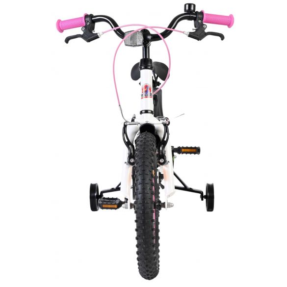 De Volare Lily 16 inch kinderfiets is een prachtige fiets voor jonge meiden die graag in stijl fietsen. Met haar frisse witte kleur, paarse en roze accenten en opvallende roze velgen en handvaten is deze fiets een echte eyecatcher.