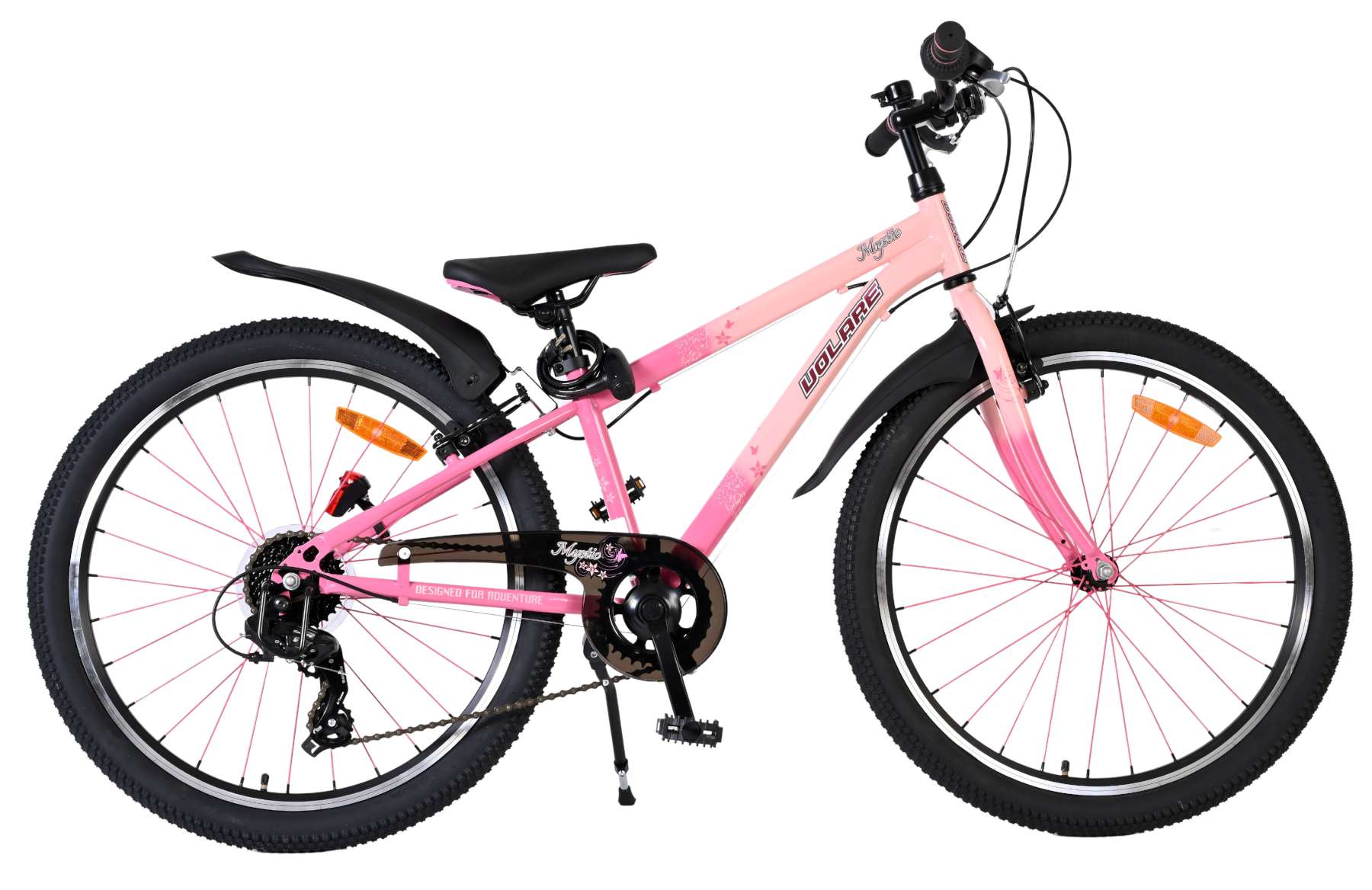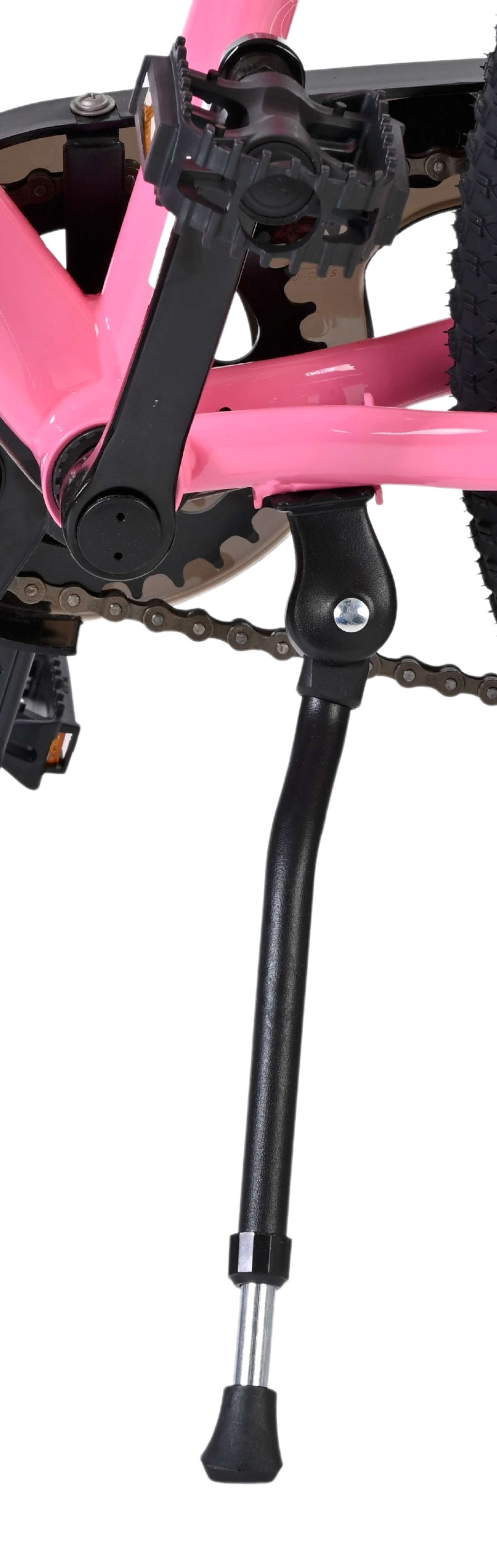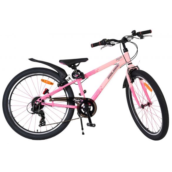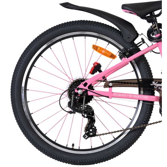 De Volare Mystic is uitgerust met verlichting aan de voor- en achterkant en reflectoren in de wielen, wat zorgt voor goede zichtbaarheid in het verkeer. Het sportieve karakter van de fiets wordt benadrukt door de opvallende roze spaken, die de fiets een unieke uitstraling geven. Daarnaast beschikt de fiets over een slot en een bel, zodat je kind veilig en goed voorbereid op pad kan.