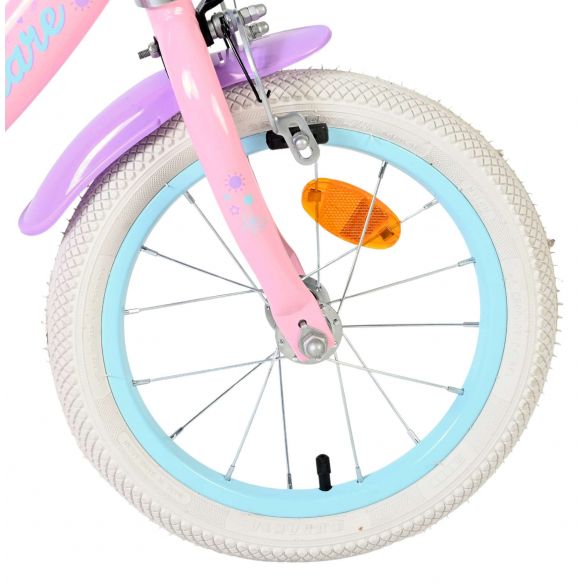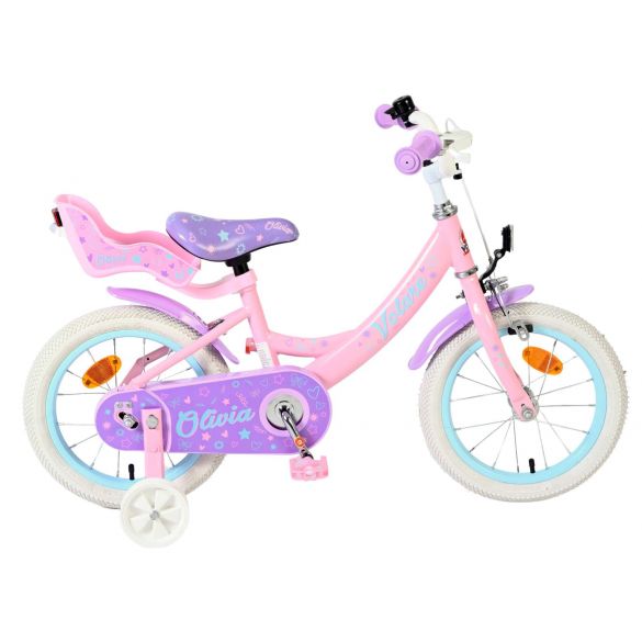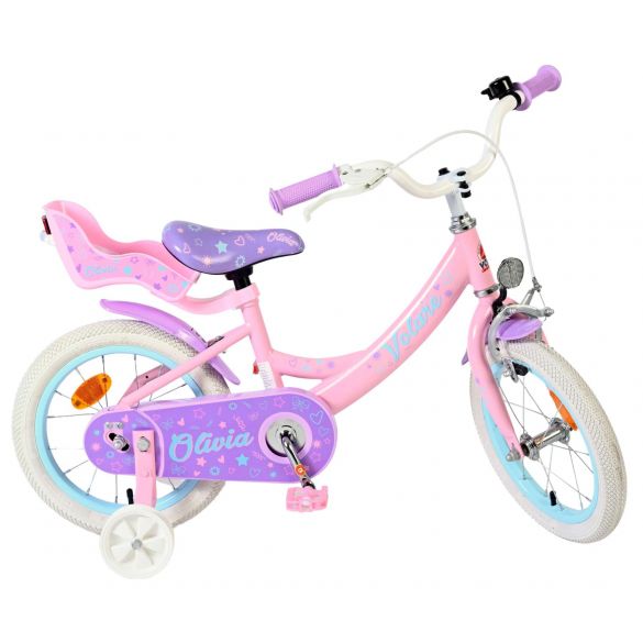 De Volare Olivia 14 inch kinderfiets is een schattige en stijlvolle fiets voor jonge meiden die vol trots willen leren fietsen. Met haar zachte roze kleur, paarse handvaten, zadel en spatborden is deze fiets een echte blikvanger.