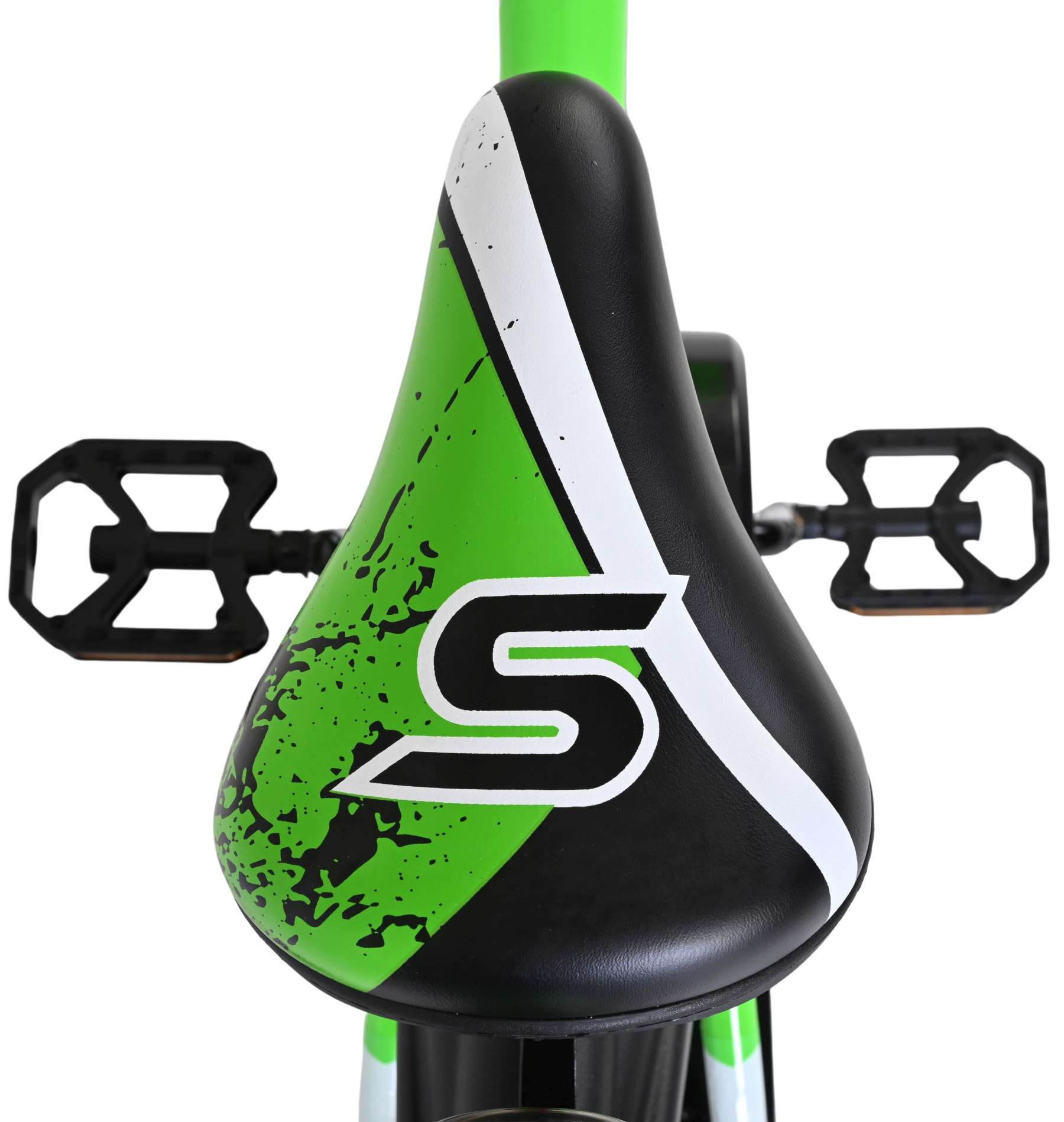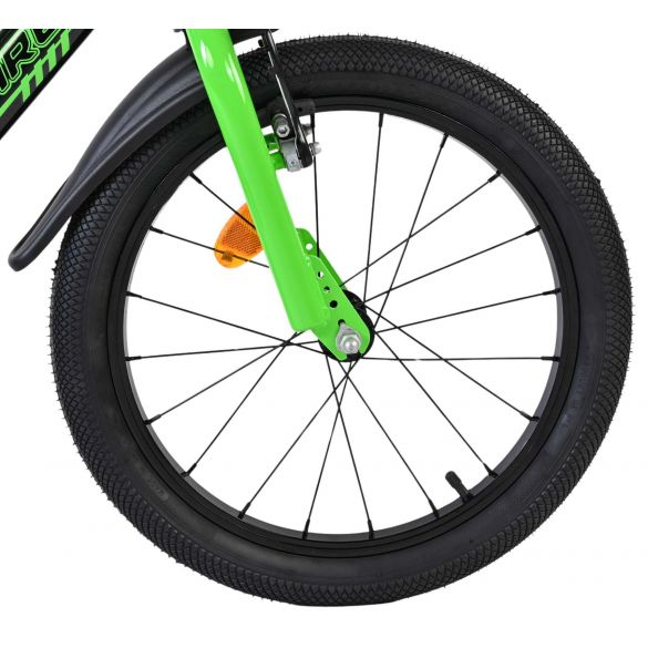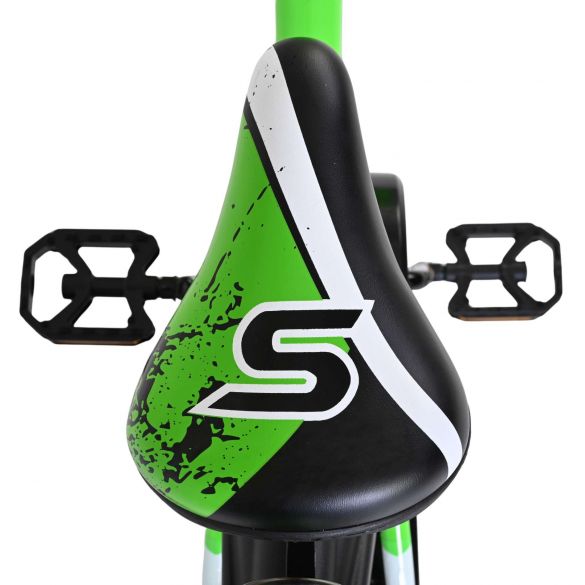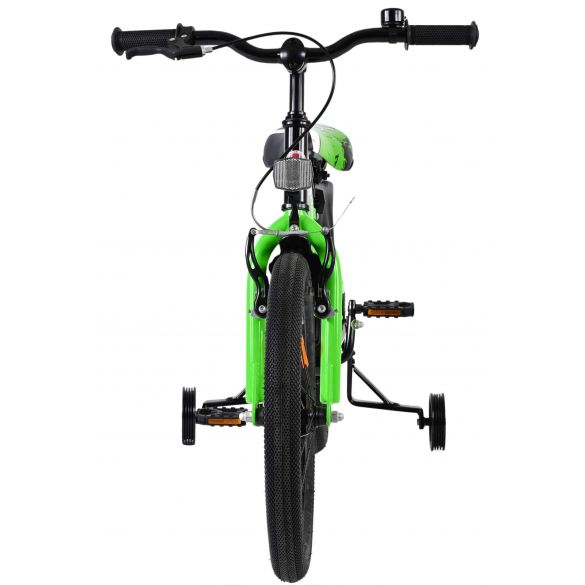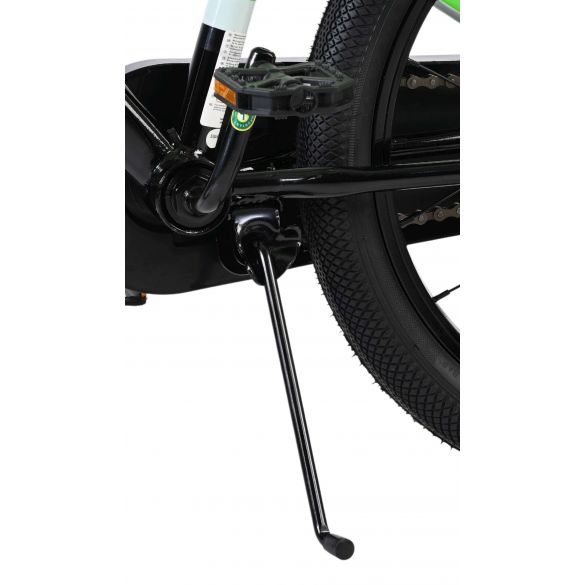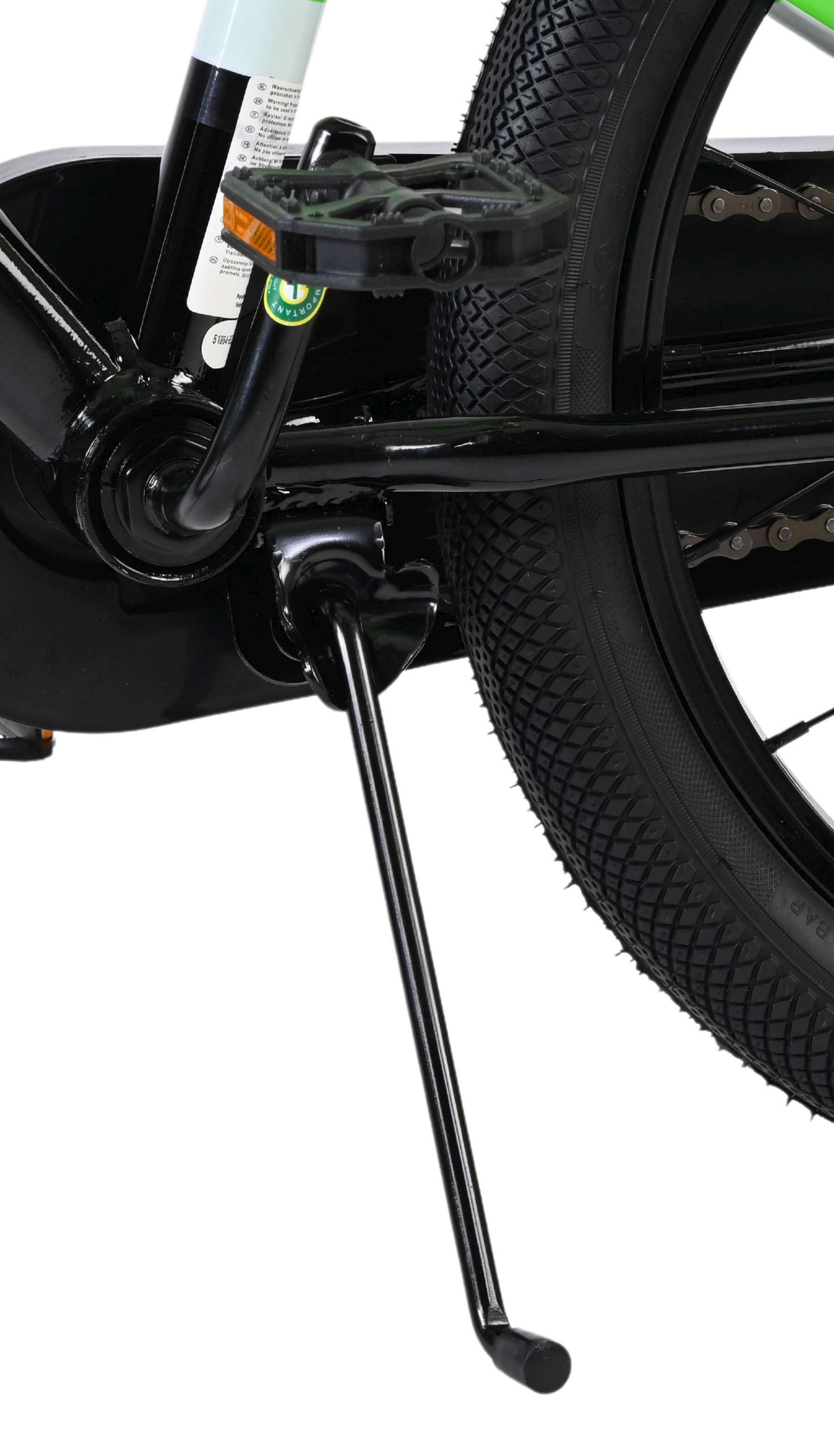 Sicherheit steht an erster Stelle! Der stabile Stahlrahmen sieht mit der coolen grün-schwarzen Farbkombination sehr sportlich aus. Mit der Wasserflasche im praktischen Flaschenhalter hat Ihr Kind immer etwas zu trinken dabei. Die Schutzbleche halten jeden spritzenden Schmutz ab. Um die Geschwindigkeit zu reduzieren, hat das Fahrrad eine Hand- und eine Rücktrittbremse. Um kleine Finger zu schützen, ist der Kettenschutz geschlossen. Mit dem praktischen Ständer steht das Fahrrad immer ordentlich.