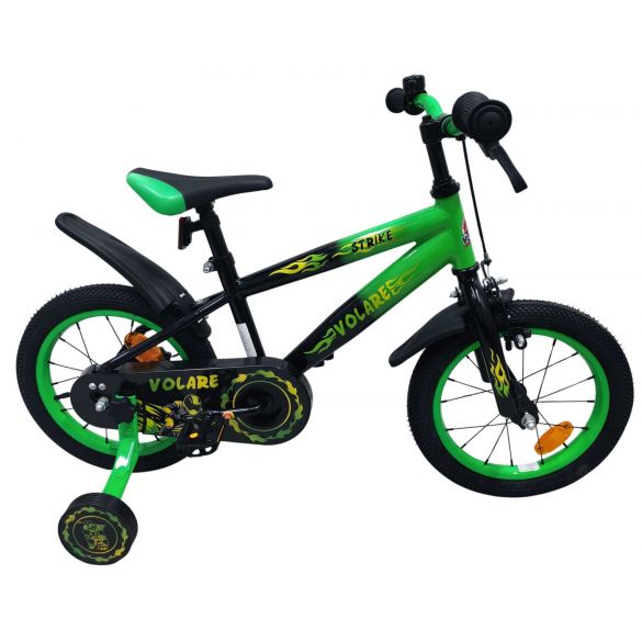 De Volare Strike 14 inch kinderfiets is een stoere fiets voor jonge racers die klaar zijn voor hun eerste grote avonturen op twee wielen. Met zijn sportieve zwart-groen design en robuuste uitstraling is deze fiets een echte blikvanger.