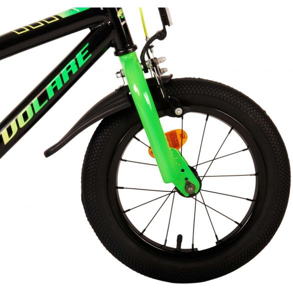 Veiligheid staat voorop! Daarom heeft deze gave fiets geen terugtraprem maar twee handremmen, een gesloten kettingkast en afneembare zijwieltjes. Daarnaast heeft de fiets reflectoren in de wielen, voor- en achterop de fiets en een leuke bel. Ook aan het comfort is gedacht. De mooie zwarte Volare fiets met groene accenten heeft een zacht zadel, een tijdloos design, en een uniek frame dat wel tegen een stootje kan. Om zo lang mogelijk van de fiets te kunnen genieten zijn het zadel en stuur in hoogte verstelbaar. Wordt geleverd inclusief al het montagemateriaal dat nodig is om de fiets in elkaar te zetten!
