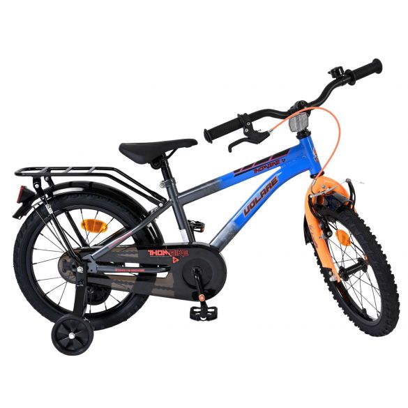 De Volare Thombike 16 inch kinderfiets in blauw met oranje details is perfect voor jonge fietsers die houden van een stoere en moderne uitstraling. Deze degelijke kinderfiets is voorzien van een dichte kettingkast, waardoor de bewegende onderdelen veilig zijn afgeschermd en de fiets minder onderhoud vraagt. Met de afneembare zijwielen kan ieder kind stap voor stap leren fietsen en later moeiteloos overstappen naar zelfstandig fietsen.