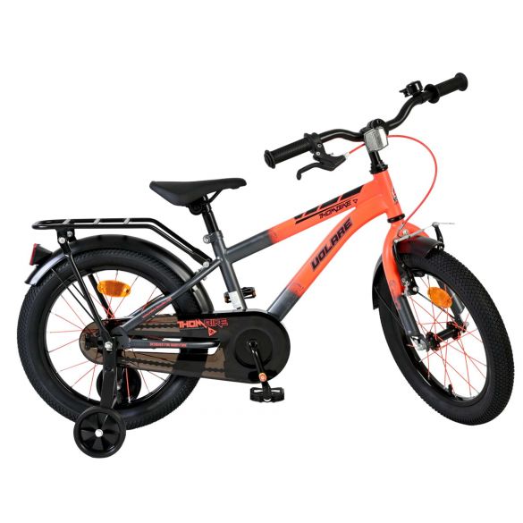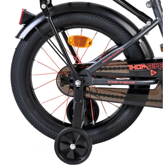 De Volare Thombike 16 inch kinderfiets in oranje met grijze details is perfect voor jonge fietsers die houden van een stoere en moderne uitstraling. Deze degelijke kinderfiets is voorzien van een dichte kettingkast, waardoor de bewegende onderdelen veilig zijn afgeschermd en de fiets minder onderhoud vraagt. Met de afneembare zijwielen kan ieder kind stap voor stap leren fietsen en later moeiteloos overstappen naar zelfstandig fietsen.