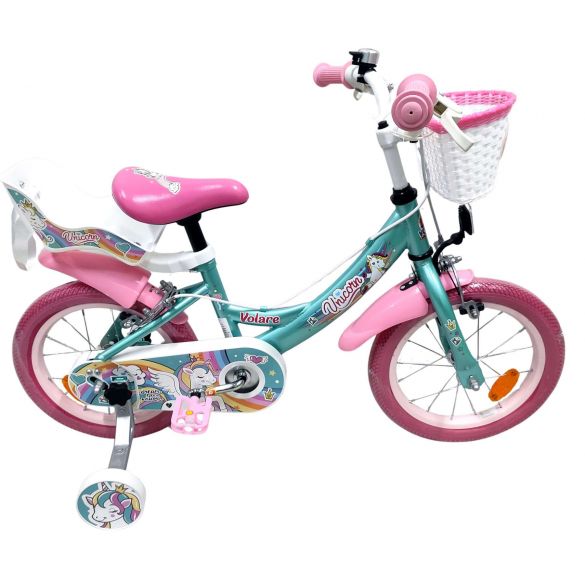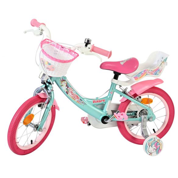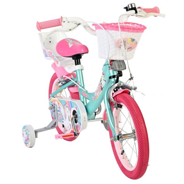 De Volare Unicorn 14 inch is een kleurrijke en speelse meisjesfiets voor kinderen die dol zijn op Unicorns en avontuur. Deze prachtige groene fiets is versierd met vrolijke Unicorn- en regenboogdetails, waardoor elke rit extra magisch wordt.