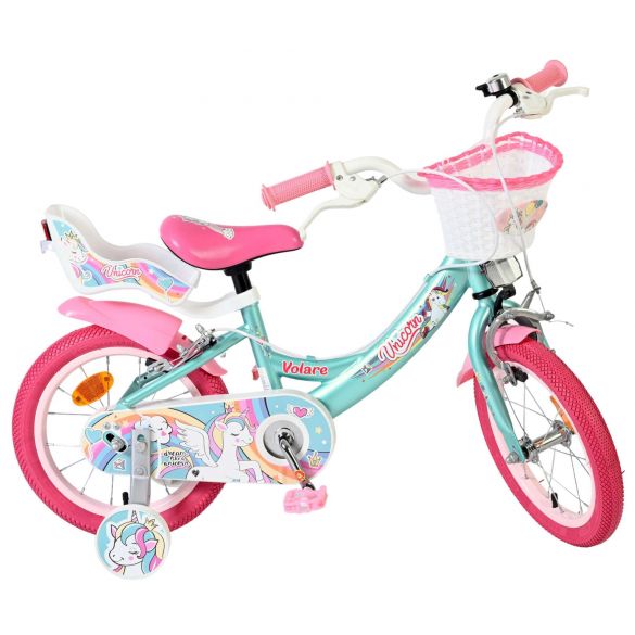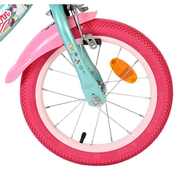 De Volare Unicorn 14 inch is een kleurrijke en speelse meisjesfiets voor kinderen die dol zijn op Unicorns en avontuur. Deze prachtige groene fiets is versierd met vrolijke Unicorn- en regenboogdetails, waardoor elke rit extra magisch wordt.